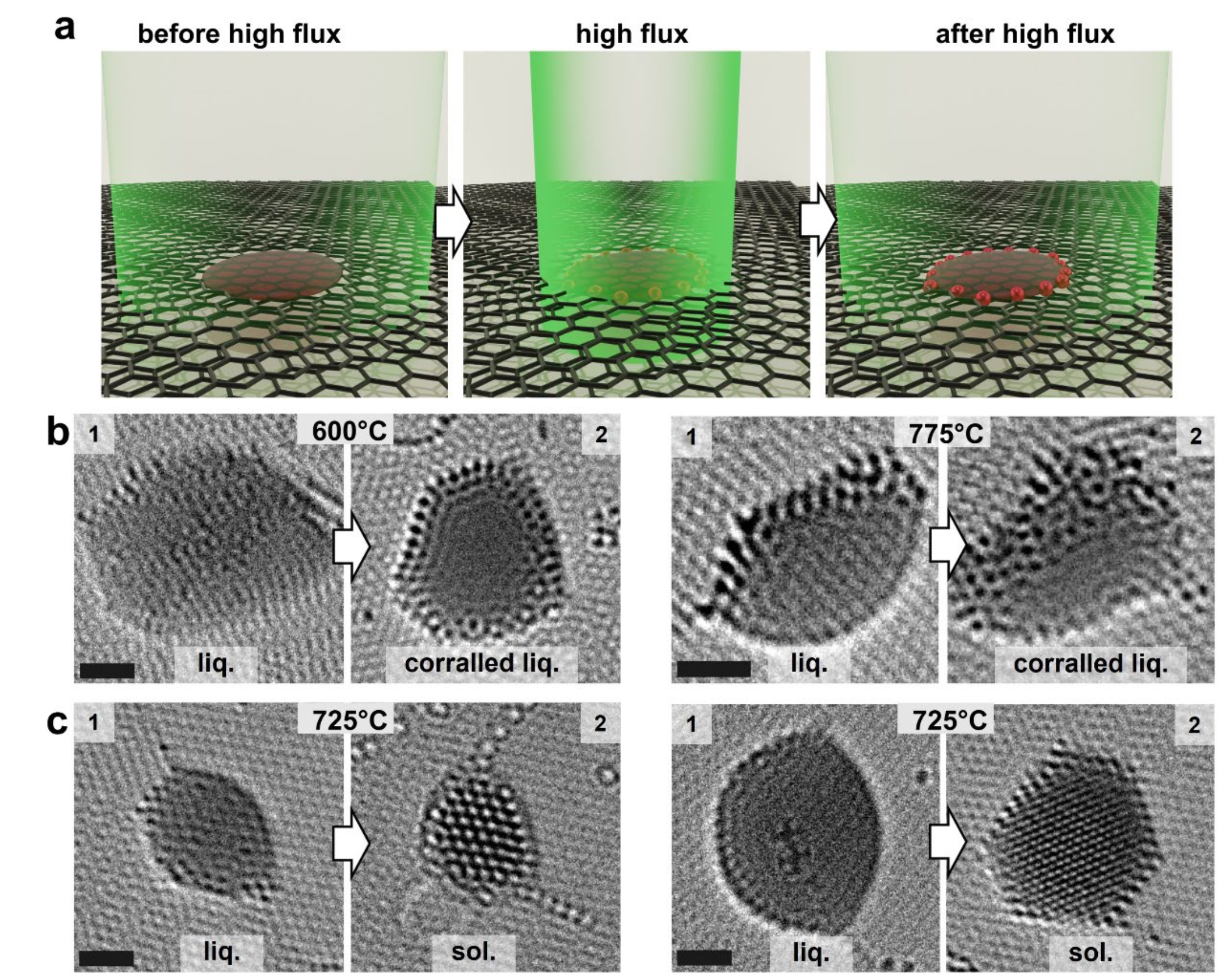 The authors were able to show that irradiating a single molten particle with a high flux of the 80 kV electron beam—by focusing the beam on the particle for a few seconds (Fig. 2a)—results in the liquid nanoparticle being surrounded by a ring of fixed platinum atoms (Fig. 2b). Further high-flux irradiation can completely solidify the particle. Liquid nanoparticles can indeed be solidified in a single step by irradiation with a high-energy electron beam and thus directly transformed into a crystalline phase without a temperature change (Fig. 2c). This electron beam-induced solidification occurs in molten Pt nanoparticles of varying sizes, forming face-centered cubic (fcc) lattices with different orientations. Remarkably, the nanoparticle remains liquid even under intense electron irradiation when completely encased in a second graphene layer. These observations demonstrate that controlling the environment of molten Pt nanoparticles with an electron beam allows for effective manipulation of their state.
