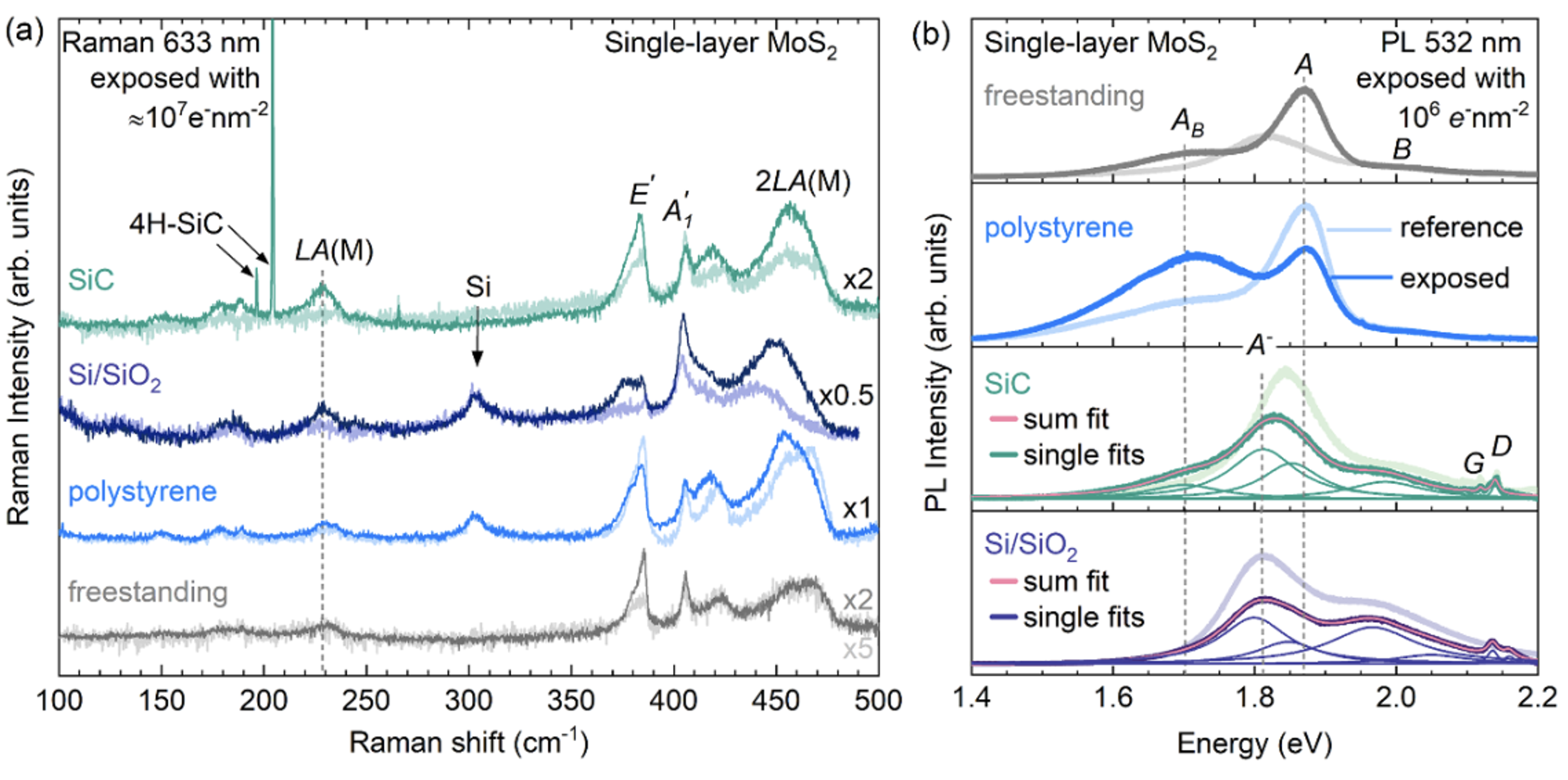 To examine substrate effects on the Raman response of irradiated MoS2, the team conducted additional measurements on freestanding MoS2 on TEM grids and on polystyrene, complementing the Si/SiO2 and SiC results (some PS data previously reported in Ref. 19). Fig. 4a compares spectra obtained at 633 nm excitation for samples receiving the same electron dose of 107 e− nm−2. Light-colored traces represent unirradiated references while dark traces show irradiated regions. Following irradiation, the defect-induced LA(M) Raman mode appears most prominently on Si/SiO2 and SiC substrates, less distinctly on polystyrene, and only weakly on freestanding samples.