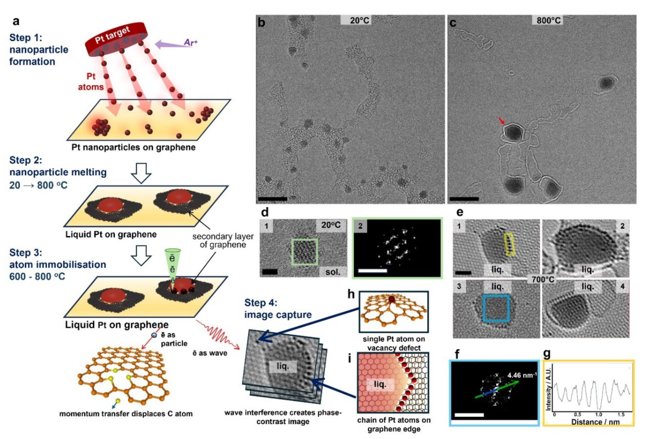December 9, 2025 – Researchers from Ulm University (Germany) and the University of Nottingham (United Kingdom) have discovered that stationary atoms play a crucial role in the solidification process of liquid metal nanoparticles. Using aberration-corrected low-voltage TEM, they demonstrated that metal atoms bound to graphene vacancies can keep liquid platinum super-cooled more than 1000 °C below the bulk solidification temperature, enabling unprecedented control over crystallization dynamics at the atomic scale.