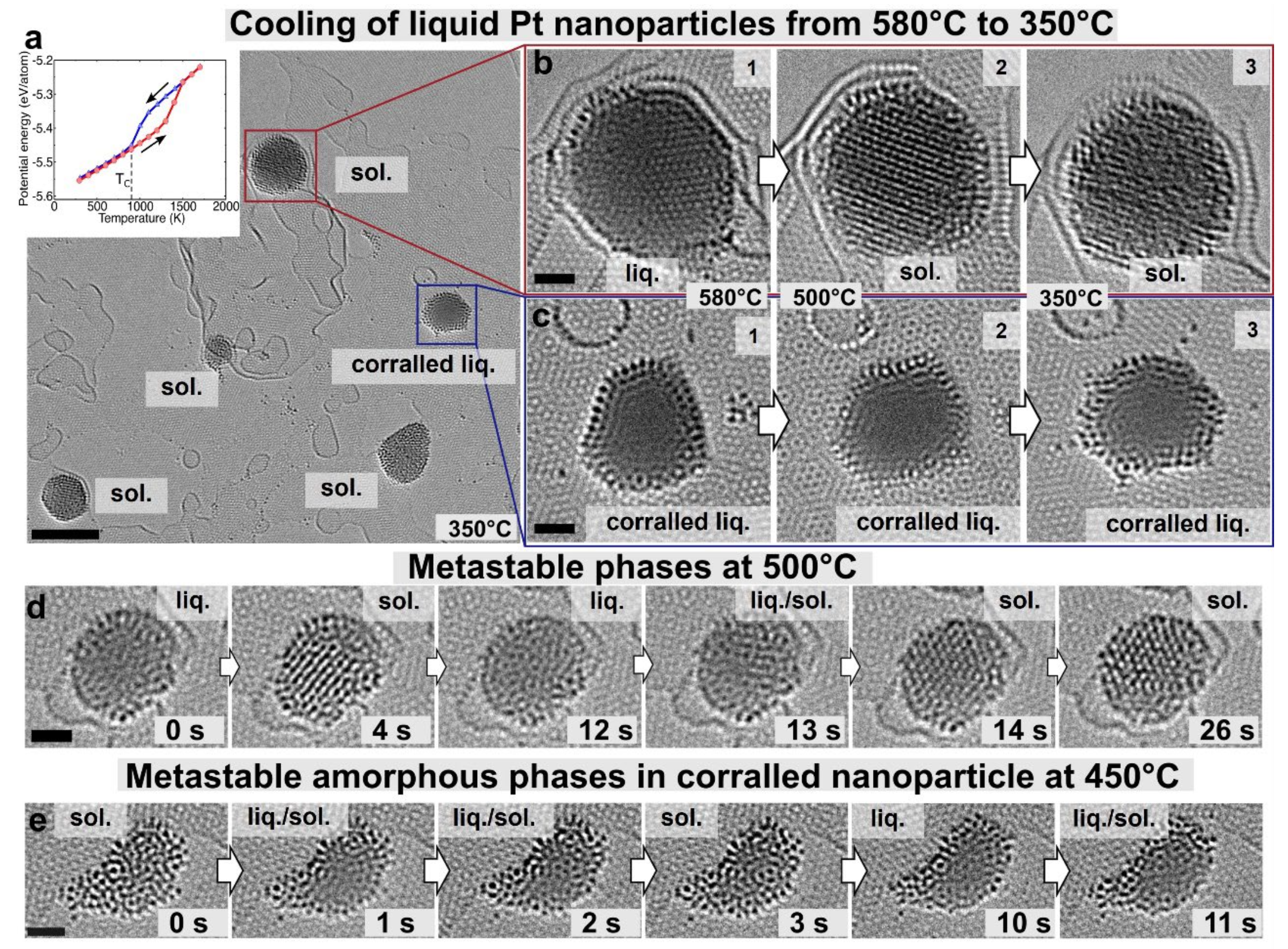 Using MEMS-heated chip technology, the authors gradually lowered the temperature from 20 to 800 °C and observed the changes in the nanoparticles using HRTEM. Surprisingly, the solidification dynamics of molten platinum showed considerable variation, even within the same field of view. This resulted in different solidification temperatures and mechanisms, influenced by the local environment (Fig. 3a–c). The solidification temperatures were generally below the melting temperatures, which is consistent with the hysteresis predicted by calculations using the embedded atomic method (EAM) (Fig. 3a, inset). In the simple case of homogeneous nucleation, the crystalline phase coexists with the liquid phase within the same nanoparticle. This metastable state undergoes dissolution and recrystallization within minutes, with a critical nucleation size of approximately 2 nm (Fig. 3d). Stationary atoms in the liquid favor crystallization from the center outwards, with the crystal faces gradually spreading across the entire nanoparticle (Fig. 3d). However, molten nanoparticles enclosed by a ring of stationary Pt atoms behave differently. While unenclosed Pt nanoparticles crystallize at around 500 °C, as evidenced by the appearance of a Pt-fcc lattice contrast (Fig. 3b), the enclosed particles remain liquid down to significantly lower temperatures and fluctuate between liquid and amorphous solid states (Fig. 3c, e).